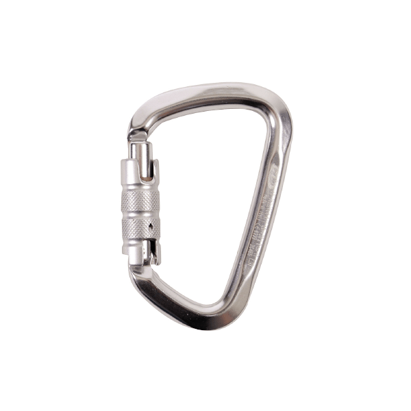 A large, alloy, triplock karabiner supplied with a captive bar. Wide opening gate with catch free locking and an excellent breaking strength. Made from anodised light alloy.